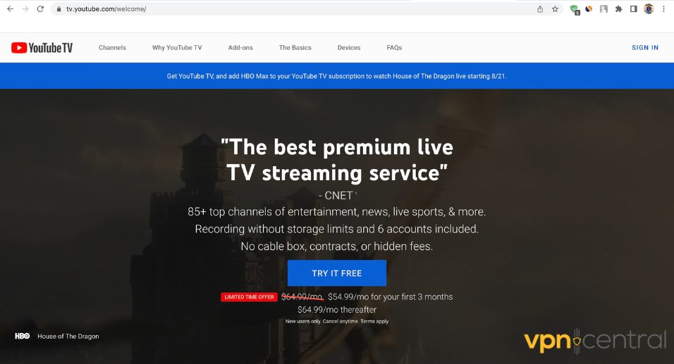 If you reside in the United States, visit YouTube TV and sign up for YouTube TV.