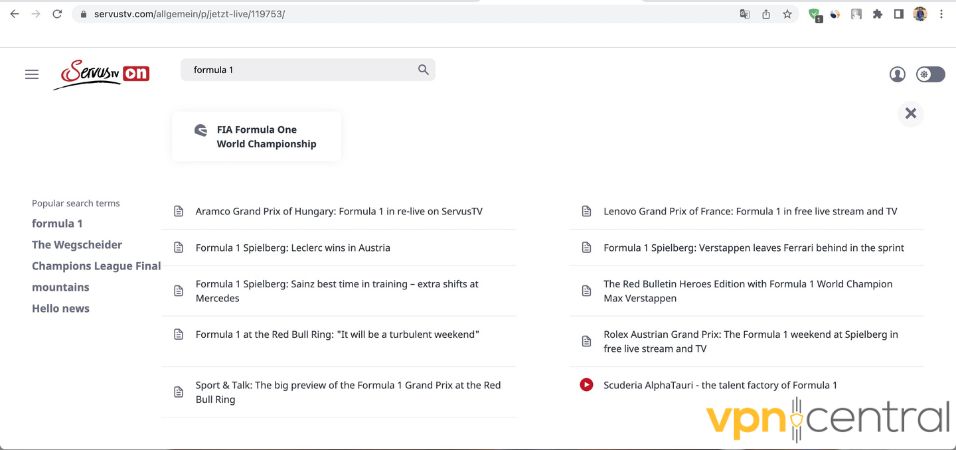 7. You can also use the search bar at the top of the Servus TV page and search for Formula 1 to see more coverage of Formula 1.