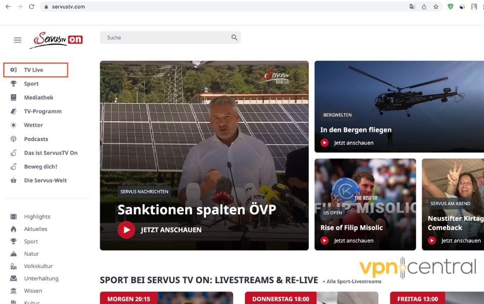 5. On the Servus TV home page, click on the TV Live option in the left-hand sidebar.