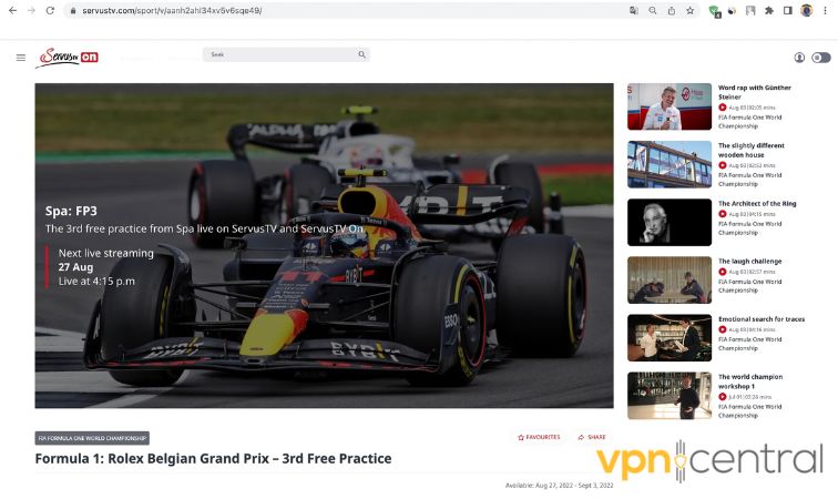 This guide shows you how to watch F1 using a VPN from the Austria server. However, in our testing, we find Austria’s online broadcaster, Servus TV, does NOT always do the live streaming of F1. Sometimes, the stream is a bit delayed.