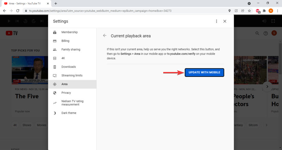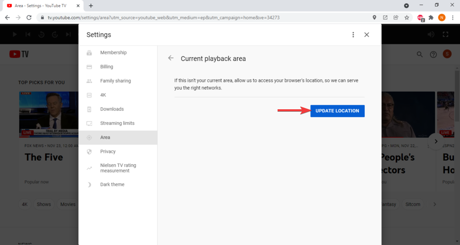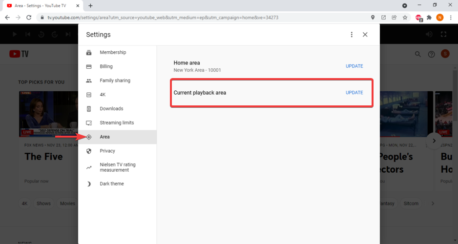 2. Change your YouTube TV area
