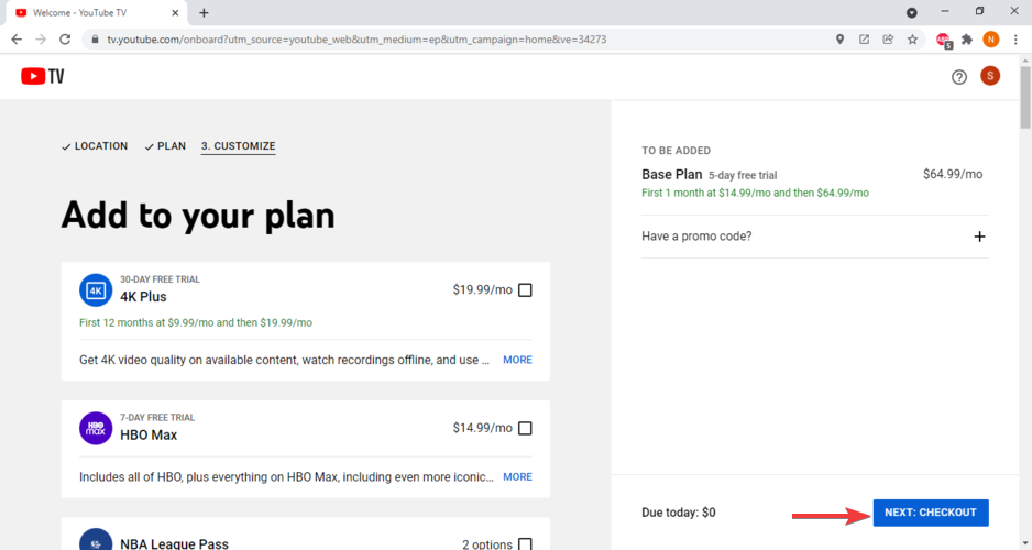 - Customize your plan if you wish, then click on NEXT: CHECKOUT.