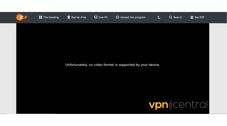 A VPN can help you bypass ZDF’s geo-restrictions by masking your actual IP address and making it appear as if you’re accessing the internet from a location in Germany. I tried visiting the streaming platform without a VPN and I got an error: