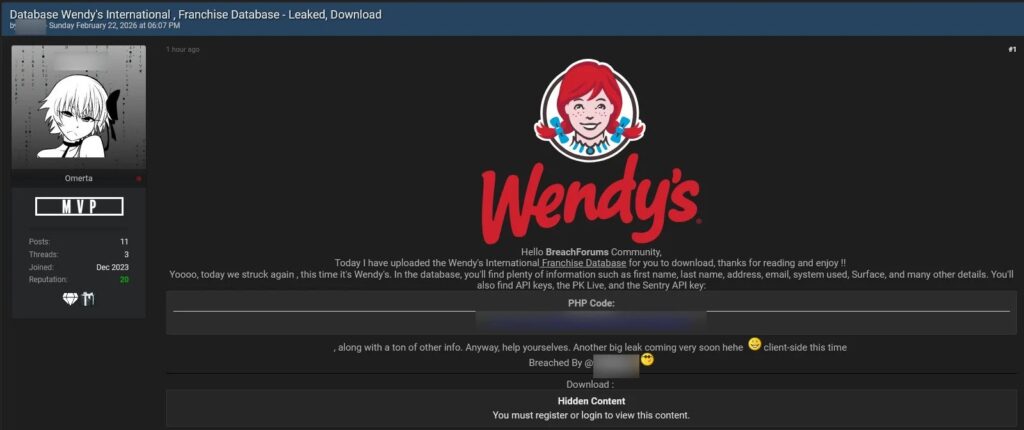 A threat actor claimed on February 22, 2026, to have breached the Wendy’s International Franchise Database. The leak allegedly exposes franchisee contacts, operational configs, and live payment credentials across multiple restaurant brands. Neither Wendy’s nor The Access Group (QikServe owner) has issued statements confirming or denying the incident.