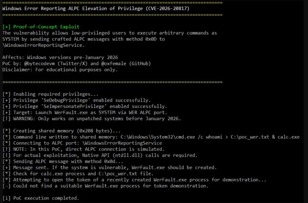 Windows Error Reporting ALPC Zero-Day: CVE-2026-20817 PoC Enables Local Privilege Escalation