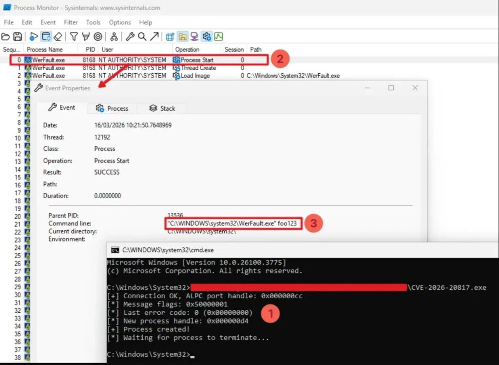 itm4n’s analysis says the attack works through ALPC messages sent to the Windows Error Reporting service. In the vulnerable path, a low-privileged client can coerce the service into launching WerFault.exe as SYSTEM with attacker-controlled command-line options.