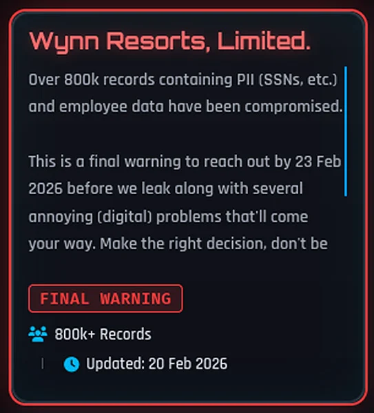 Wynn Resorts acknowledged unauthorized access to employee data following ShinyHunters extortion threat. Company activated incident response hiring external cybersecurity experts immediately. Attackers claimed 800K records with SSNs before February 23, 2026 deadline. Official statement confirmed data deletion claims by threat actors.