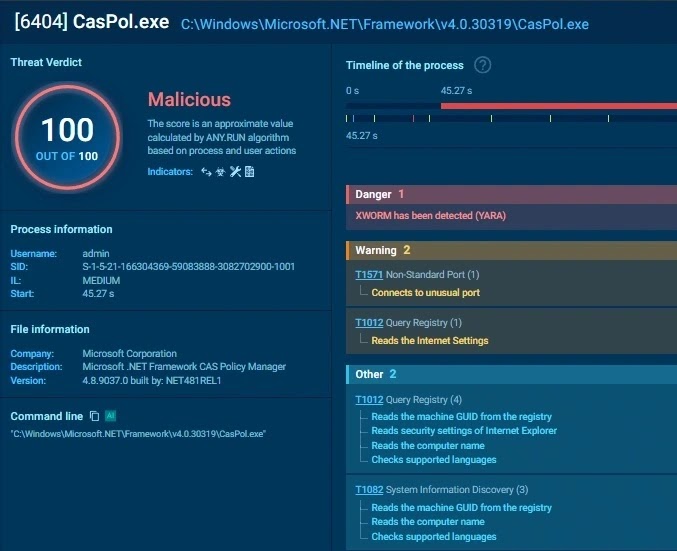 Malware hollows legitimate CasPol.exe process. Network activity from signed utility flags in sandboxes. Weak AES-ECB reveals full C2 post-infection.