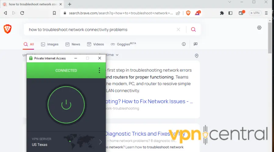 4. With your VPN connected, go to Brave browser. Try searching a query again, it should work now.