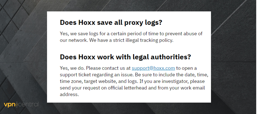 • Hoxx VPN logs user internet activities: This means that your IP address, websites visited, etc. are collected by them and stored in their database. This information can be turned in to the government without hesitation, so there’s no actual guarantee that you fully secure your connection. Here’s what they state on their official page: