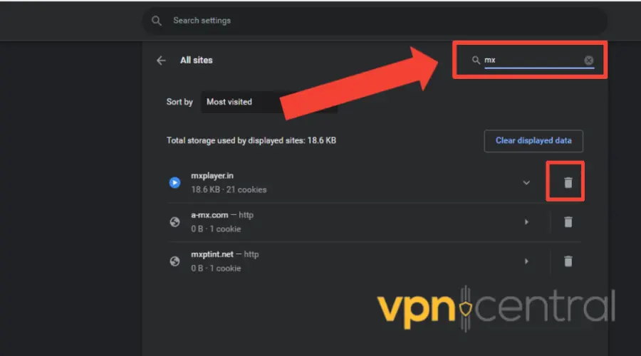 We used Chrome as an example, but the process is very similar for all major browsers. Just find your site data settings, select MX Player, and delete them. - Change the VPN server