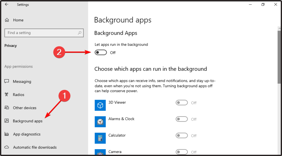 3. In the left window pane, scroll down, click on Background apps, then from the right side of the window, make sure Let apps run in the background is turned Off.