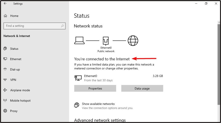 3. In the right pane of the window, make sure you get the You’re connected to the Internet message.