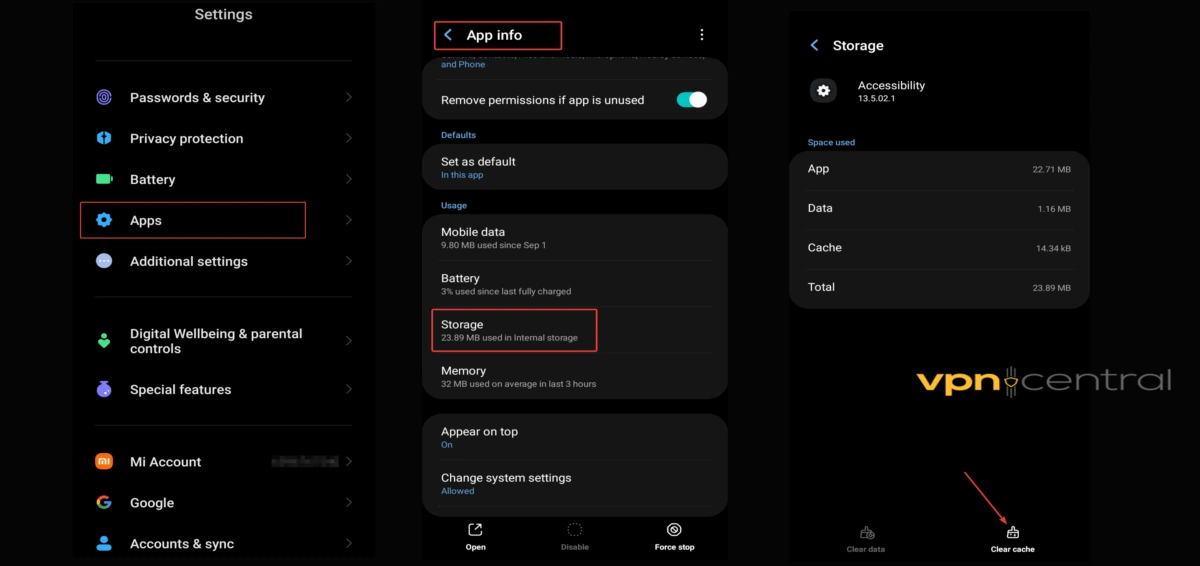 - Click on the Storage option. Click on Clear cache.