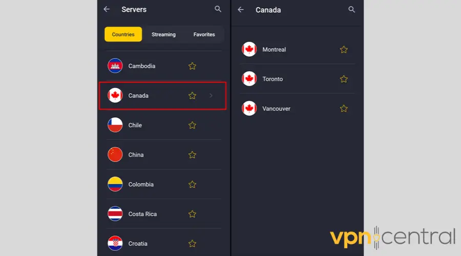 - Scroll down to Canada, then tap it to reveal its sub-list of server locations.