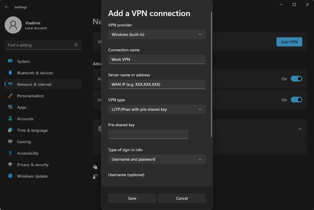 - Connection name: This can be anything you want to name this connection, for example, “Work VPN”