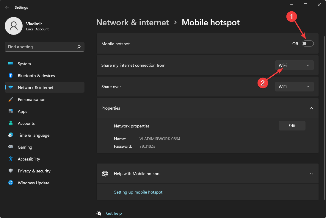- Enable the Mobile Hotspot option and choose to share your internet connection from Wi-Fi.