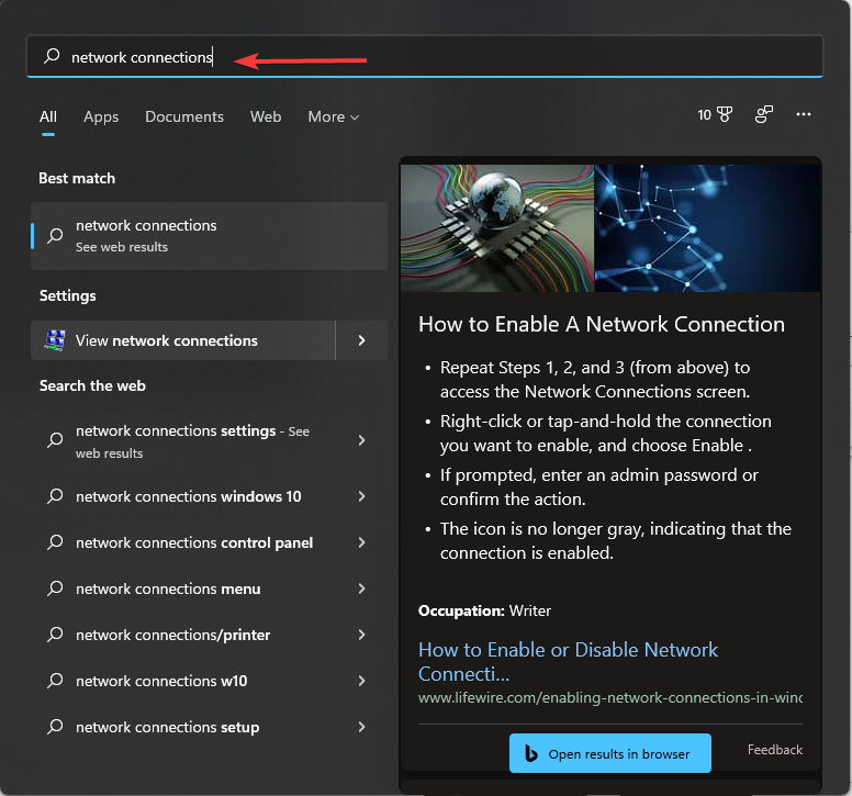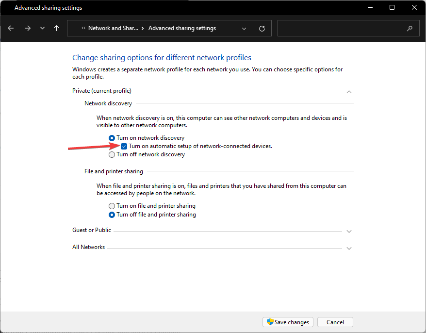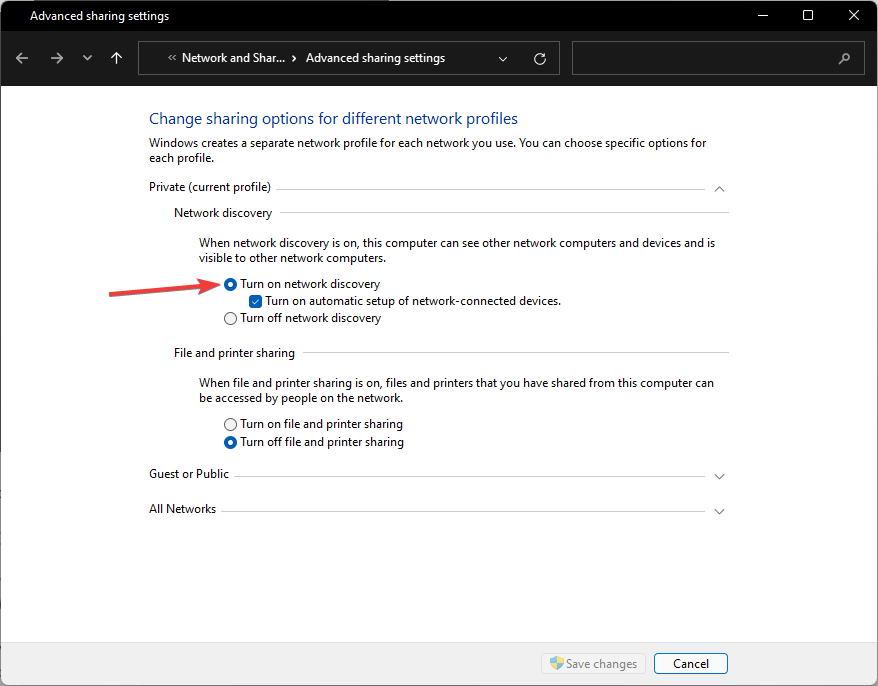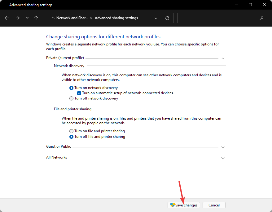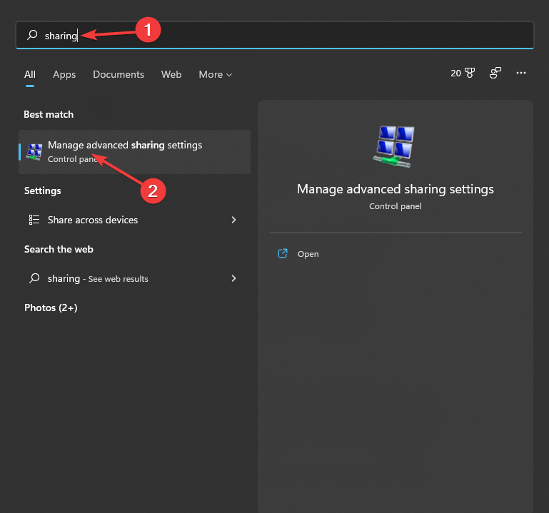 - Search for sharing, and choose the Manage advanced sharing settings option.