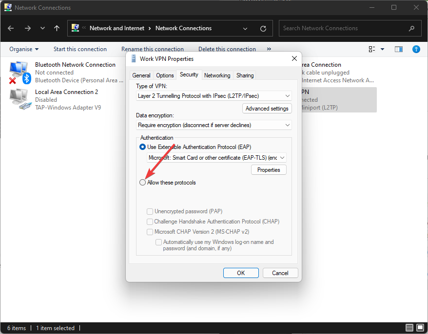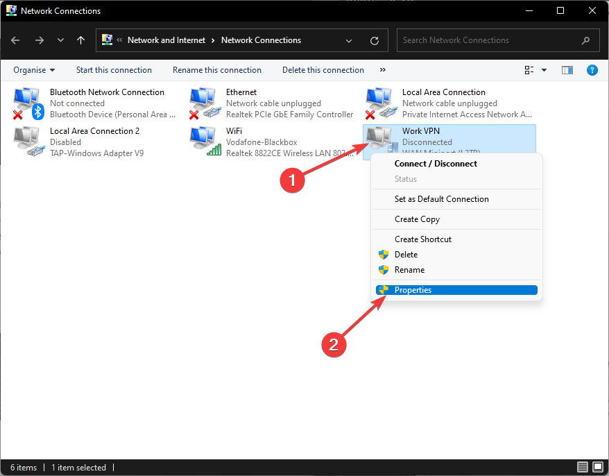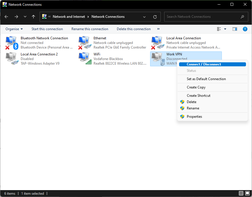 - Inside the Nework connections window, right-click the VPN connection and choose Connect/Disconnect.
