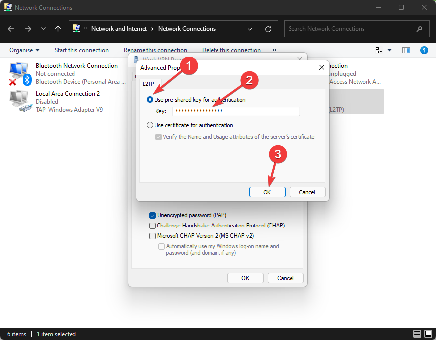 - Choose the Use preshared key for authentication option, and type in the key created by the admin, and click OK.