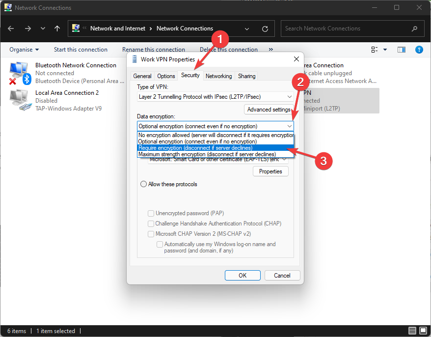 - In the Security tab, under Data encryption choose Require encryption (disconnect if sever declines).