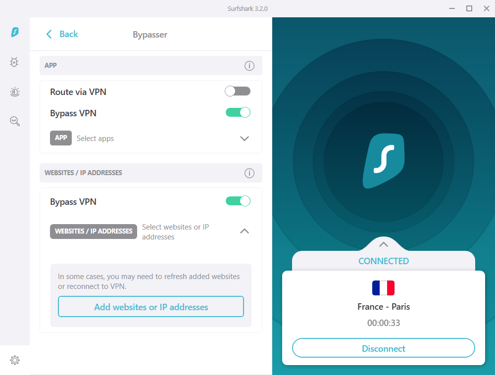Bypasser is the name Surfshark uses for split tunneling. The feature lets you control your connectivity by choosing which apps or websites use or bypass the VPN connection.